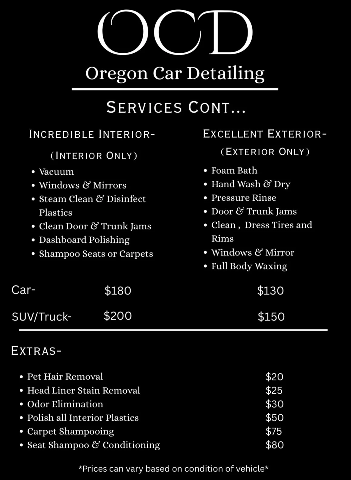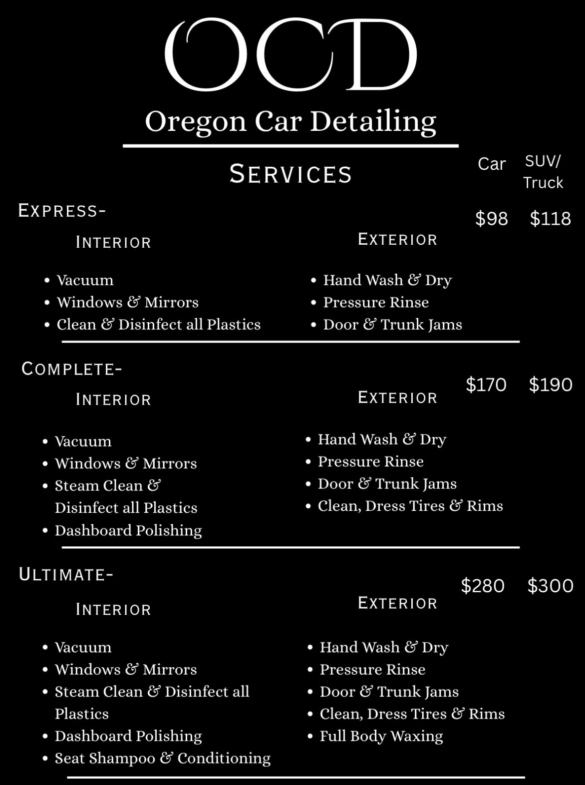 Take a look at our detailed Service & Price sheets. These will consist of every service we have to offer. Ready to give your car the treatment it deserves? After browsing our services, pick the perfect package for your vehicle and book your appointment today!